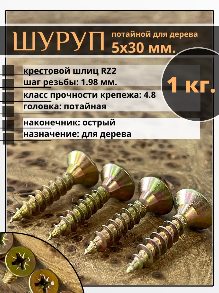 Шуруп саморез потайной для дерева 5х30 мм, желтый цинк, 1 кг.