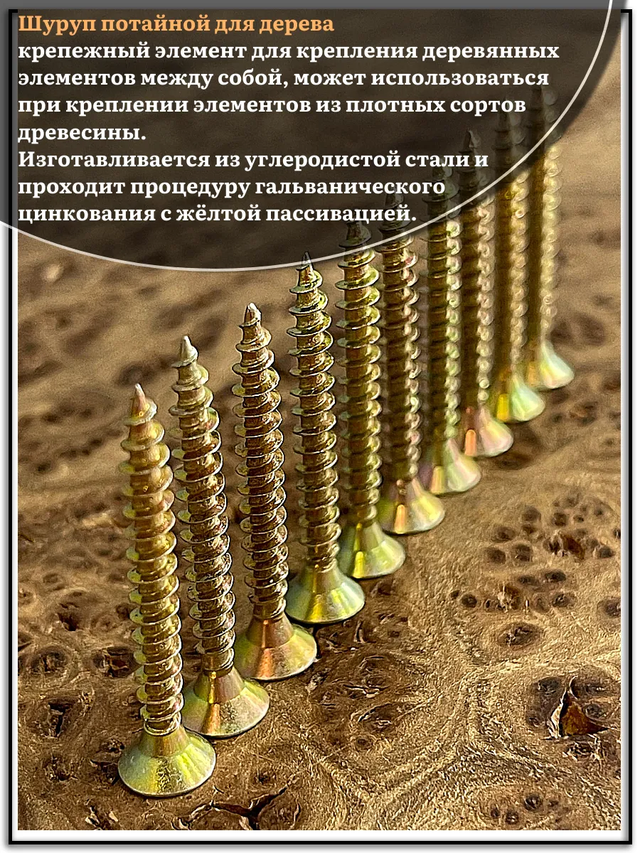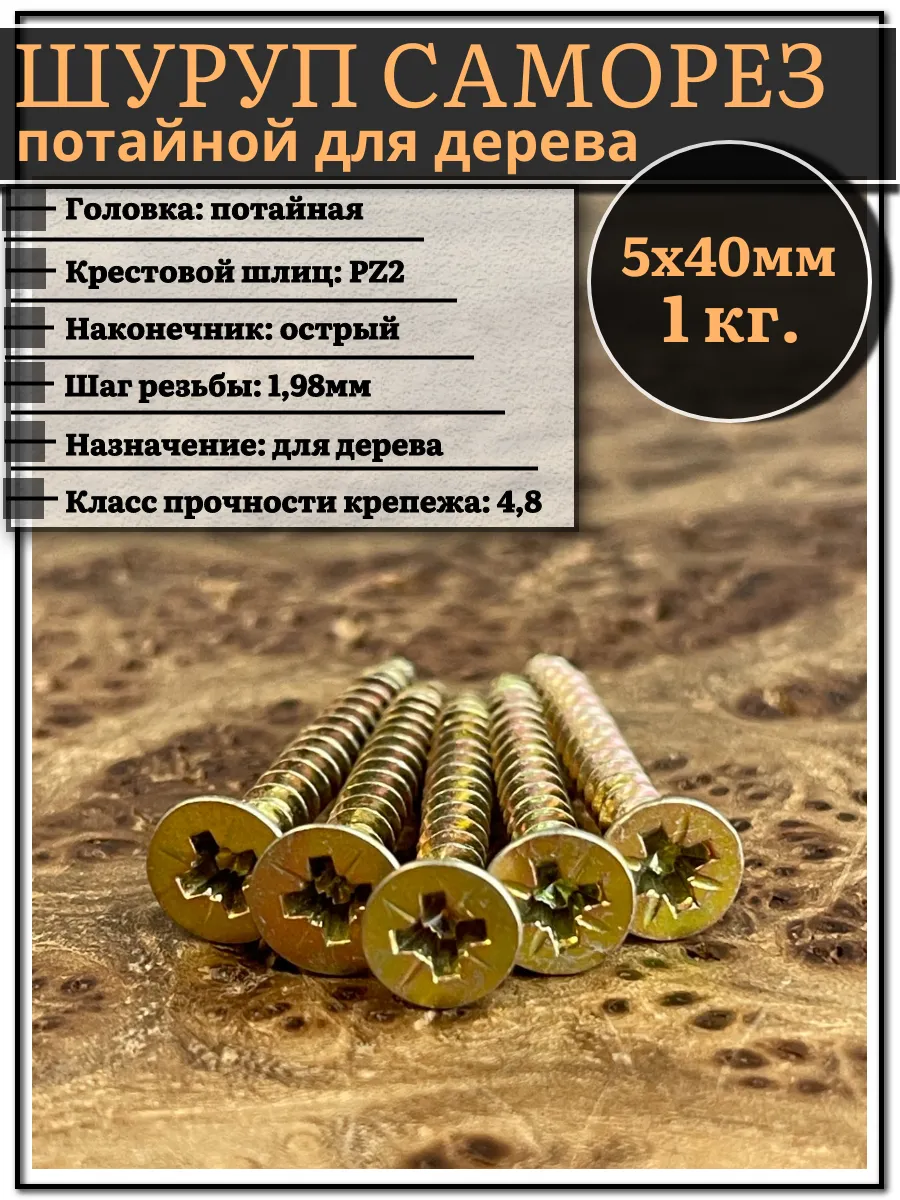 Шуруп саморез потайной для дерева 5х40 мм, желтый цинк, 1 кг. представляет собой стержень с головкой и острым наконечником. Универсальность проявляется в конструкции и области применения. Назначение шурупа — стягивать, скреплять между собой элементы: деревянных, древесностружечных и гипсокартонных плит, из тонкого листового металла. Он аккуратно и быстро вкручивается в материал без предварительного сверления, обеспечивая надежное соединение с основой. Крепежное изделие изготовлено из оцинкованной стали с дополнительной пассивацией. Саморез имеет желтый цвет. Его классическая конструкция включает заостренный цилиндрический стержень с винтовой нарезкой по всей длине, а также потайную головку с крестообразным шлицем PZ. Этот элемент служит для передачи крутящего момента от инструмента – отвертки, шуруповерта при закручивании или выкручивании крепежа.