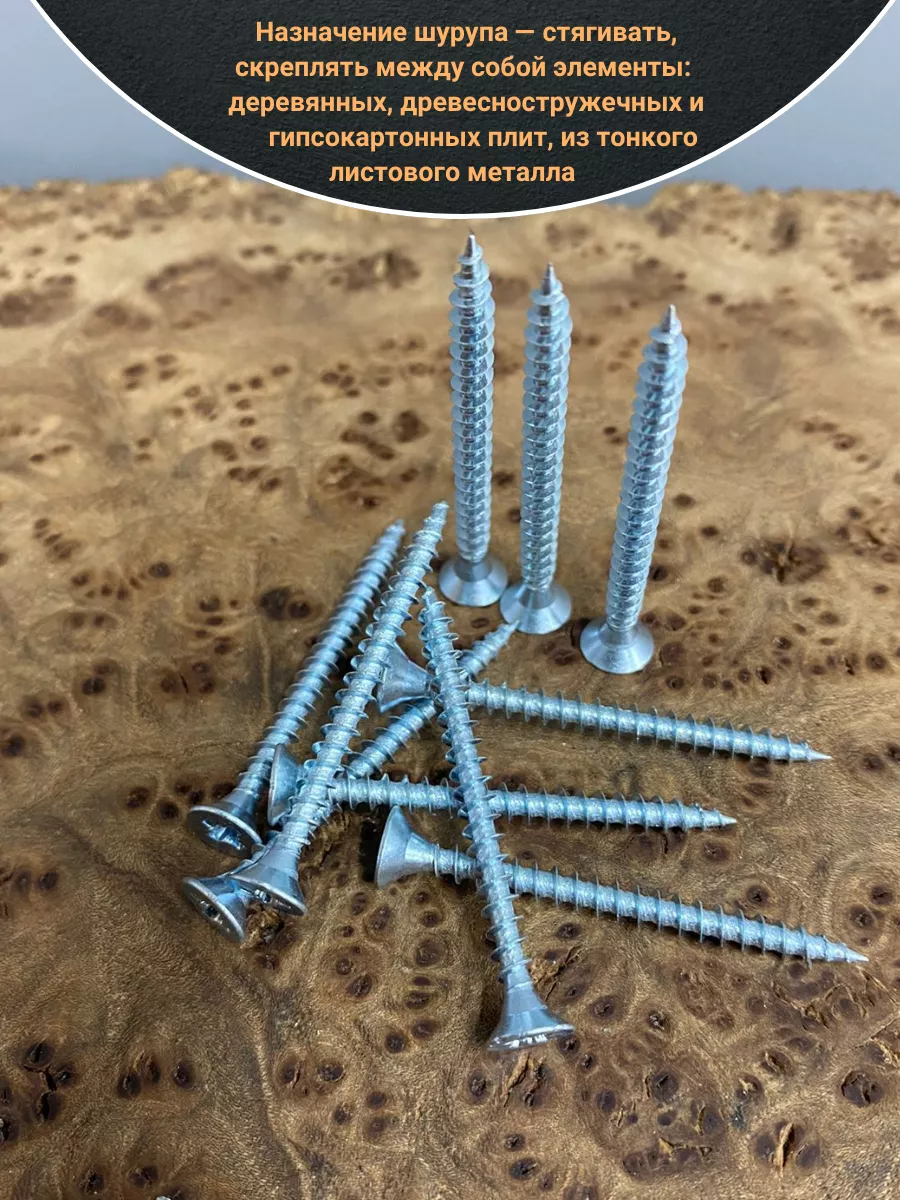 Универсальные шурупы с потайной головкой изготовлены из углеродистой стали и закалены для придания твердости поверхности и сердцевины. Для снижения рисков развития коррозии на них на нанесено гальваническое цинковое покрытие с белой пассивацией, которое улучшает защитные свойства цинка и придает гладкий блестящий внешний вид.