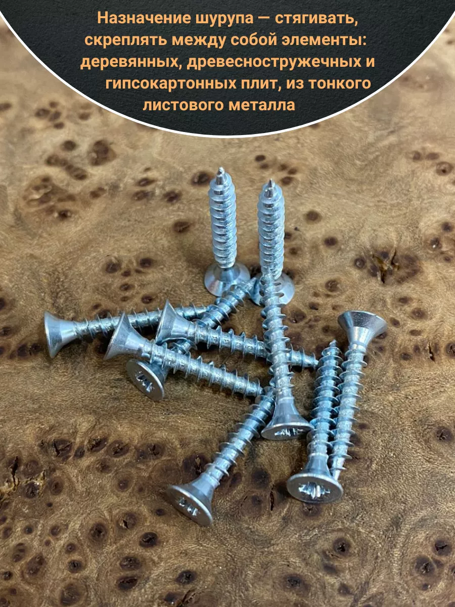 Шуруп — это металлический крепеж, представляющий собой стержень с головкой и острым наконечником. Универсальность проявляется в конструкции и области применения. Назначение шурупа — стягивать, скреплять между собой элементы: деревянных, древесностружечных и гипсокартонных плит, из тонкого листового металла.