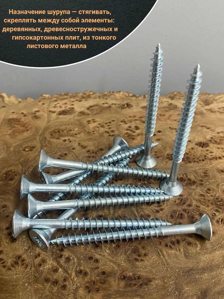 Универсальные шурупы с потайной головкой изготовлены из углеродистой стали и закалены для придания твердости поверхности и сердцевины. Для снижения рисков развития коррозии на них на нанесено гальваническое цинковое покрытие с белой пассивацией, которое улучшает защитные свойства цинка и придает гладкий блестящий внешний вид.