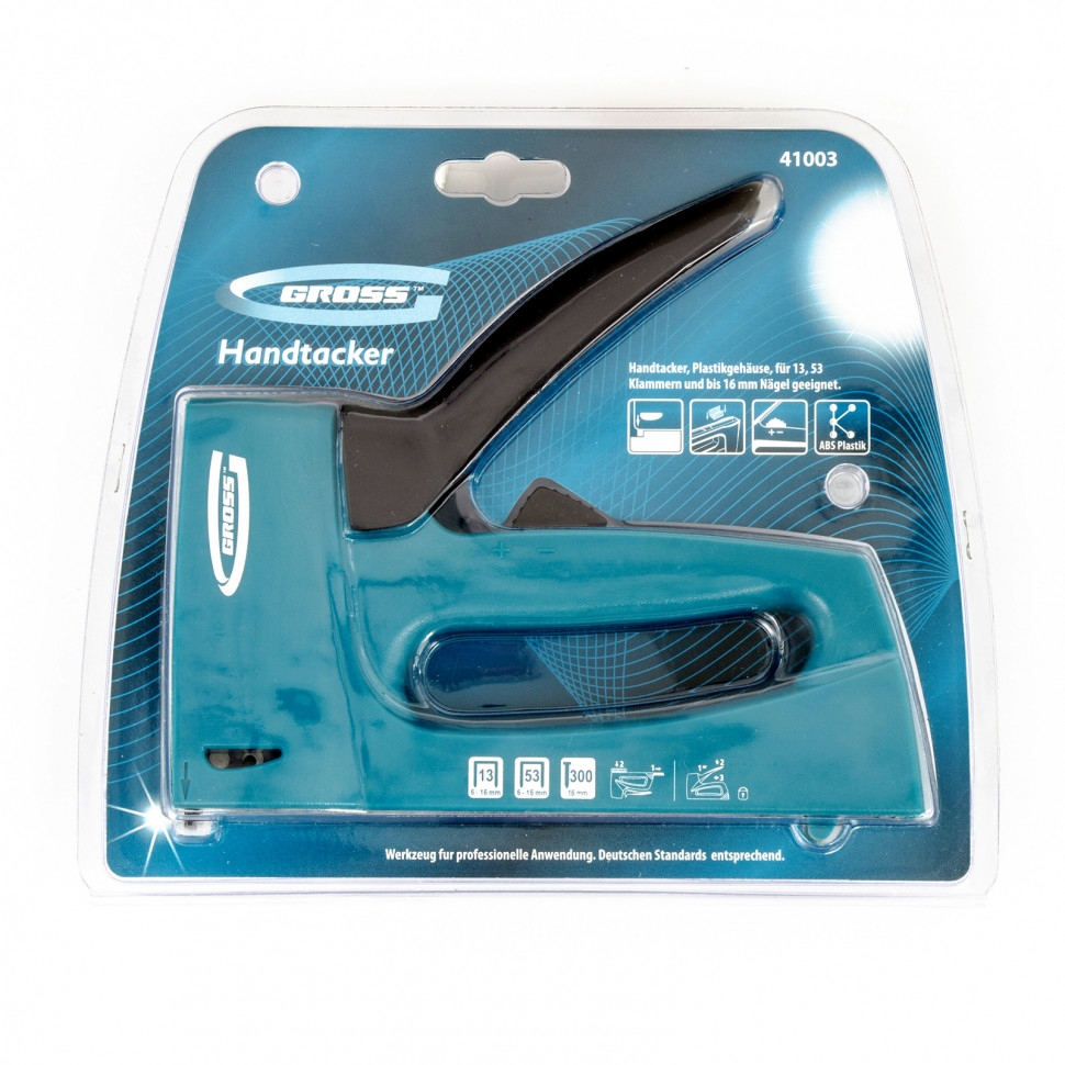 Мебельный степлер Gross 41003 в пластиковом корпусе, с функцией регулировки силы удара, совместим со скобами типа 13, 53 размером 6-16 мм и гвоздями типа 300 размером 16 мм. Его используют для быстрого крепления на деревянном основании фанеры, оргалита, ДВП, ДСП, пленки, утеплителя и других листовых материалов. Корпус устойчив к повреждениям, поскольку отлит из ударопрочного пластика. Двухпозиционный переключатель позволяет регулировать силу удара в зависимости от длины скоб и твердости материала. Действия в труднодоступных местах облегчает длинный тонкий носик. Инструмент идеально сбалансирован, что сводит отдачу к минимуму. Степлер пригодится при сборке и обшивке мебели, укладке ковровых покрытий и изоляционных материалов, выполнении багетных работ. Подходит для профессионального применения.