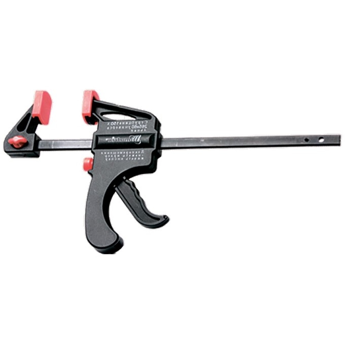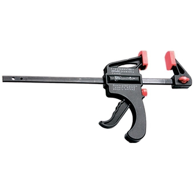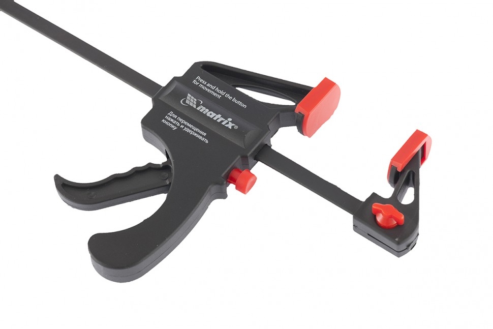 Универсальная F-образная быстрозажимная струбцина Matrix 20545, 450 х 765 х 90 мм, в пластиковом корпусе, используется в столярном деле. Позволяет быстро фиксировать заготовки с целью их соединения или обработки — склеивания, сверления, шлифовки, пиления и других видов работ. Подвижная губка перемещается вдоль штанги при помощи пластинчатого механизма, а фиксатор препятствует разжиманию струбцины. Массивная конструкция обеспечивает надежность инструмента.ПреимуществаНаправляющая изготовлена из стали и устойчива к нагрузкам, поэтому выдерживает значительные усилия при сжатии предметов.Рабочие элементы выполнены из ударопрочного пластика и обладают высокой механической стойкостью, что увеличивает срок службы инструмента.Защитные накладки на губках предохраняют зажимаемые детали от повреждений.Опорную губку можно установить на противоположный конец штанги, после чего использовать струбцину на разжим.
