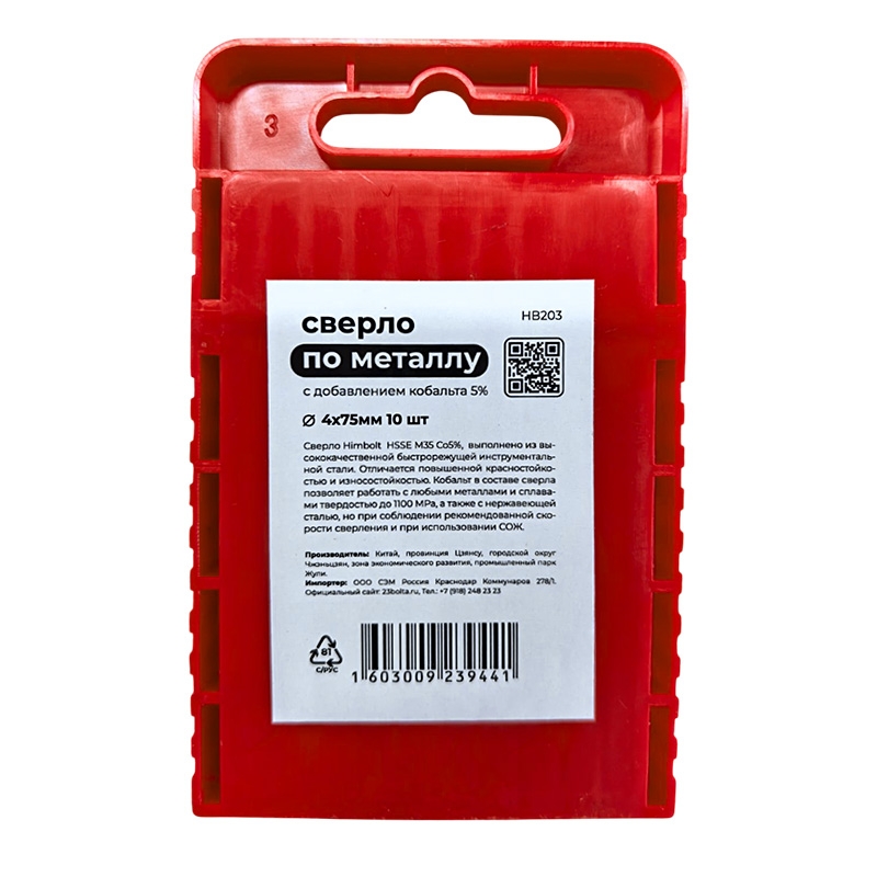 Сверло по металлу с кобальтом 5% P6M5K5 4,0 мм HIMBOLT 10 шт.пласт.бокс выполнено из высококачественной быстрорежущей инструментальной стали. Отличается повышенной красностойкостью и износостокойстью. Кобальт в составе сверла позволяет работать с любыми металлами и сплавами твердостью до 1100 МРА, а также с нержавеющей сталью, но при соблюдении рекомендованной скорости сверления и при использовании СОЖ.