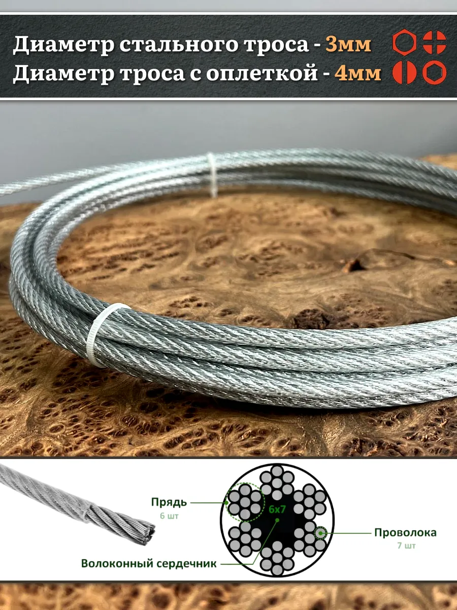 Трос стальной 3/4 оцинкованный в оплетке, 10 м.