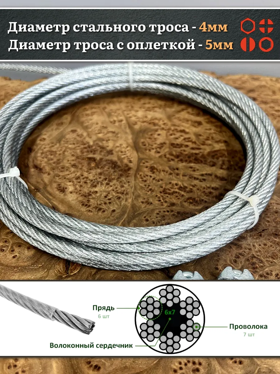 Трос стальной 4/5 с зажимами (4 шт.) оцинкованный в оплетке, 30 м.