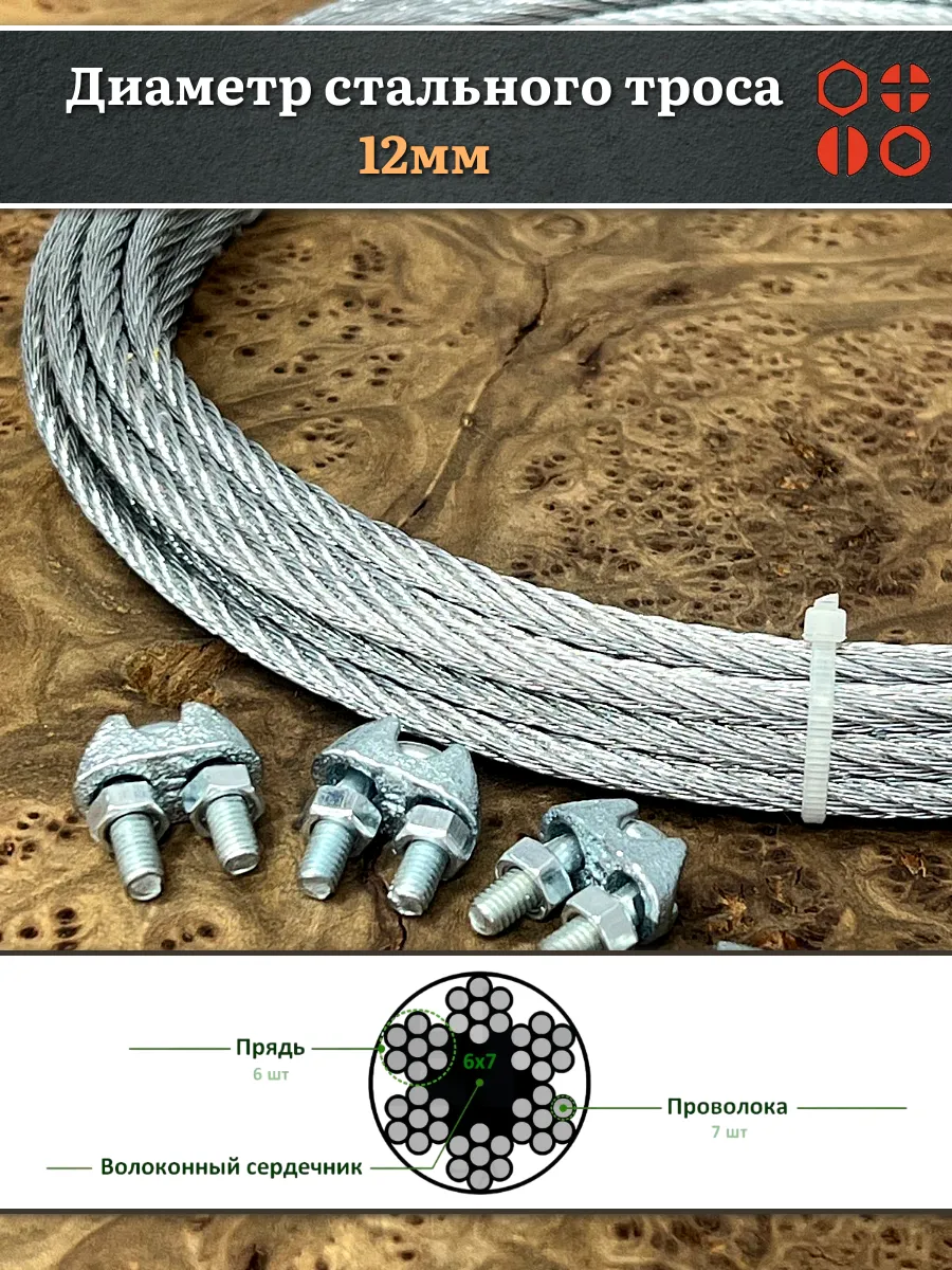 Трос стальной d12 с зажимами (4 шт.) ОЦ без оплетки, 30 метров