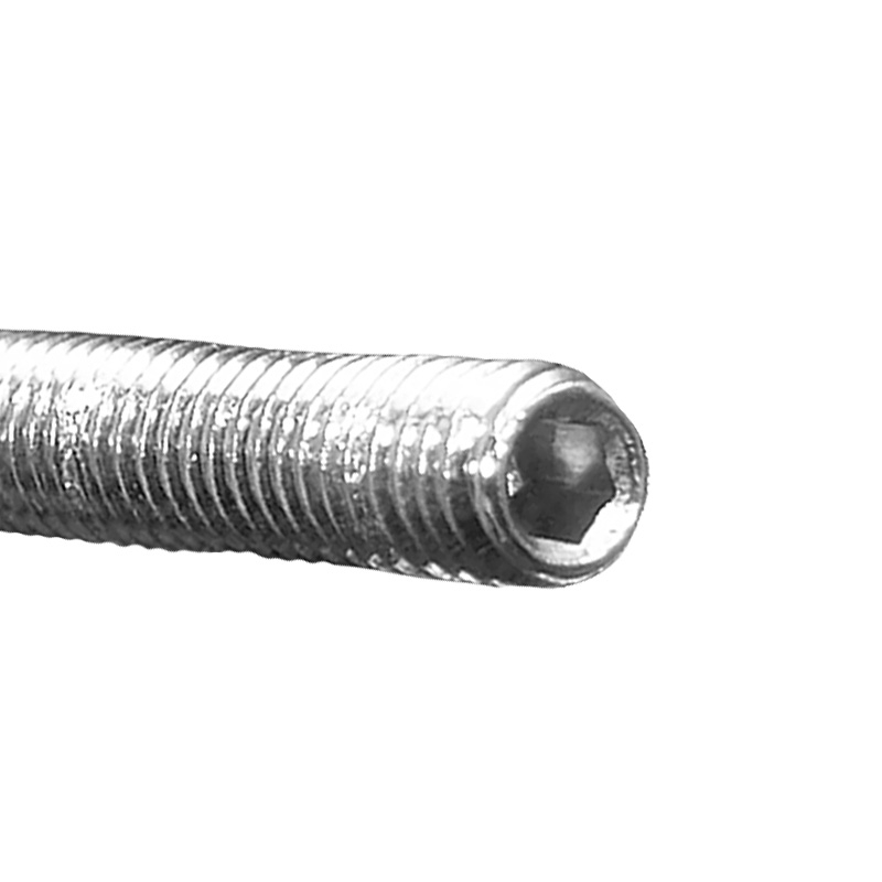 DIN 914 - винт установочный с полной метрической резьбой, с острым концом используется для соединения элементов конструкций в машиностроении, приборостроении и прочих промышленно-производственных отраслях совместно с гайками, шайбами соответствующих размеров. Производится из углеродистой стали, нержавеющей стали А2 и А4, латуни. Его можно отличить по отсутствию головки, где шлиц (углубление под плоскую отвертку или шестигранник) находится непосредственно в торце. Корпус крепежа полностью выполнен в виде резьбы и, проходя через гнездо в детали, упирается в него на всю свою длину, что повышает надежность сцепления. Нажимной кончик также бывает различной формы, может быть выполнен из разных материалов (например, нейлона) и предназначен для повышения устойчивости фиксации.