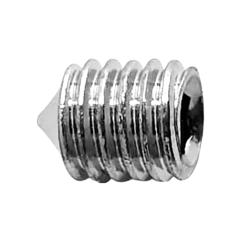 DIN 914 - винт установочный с полной метрической резьбой, с острым концом используется для соединения элементов конструкций в машиностроении, приборостроении и прочих промышленно-производственных отраслях совместно с гайками, шайбами соответствующих размеров. Производится из углеродистой стали, нержавеющей стали А2 и А4, латуни. Его можно отличить по отсутствию головки, где шлиц (углубление под плоскую отвертку или шестигранник) находится непосредственно в торце. Корпус крепежа полностью выполнен в виде резьбы и, проходя через гнездо в детали, упирается в него на всю свою длину, что повышает надежность сцепления. Нажимной кончик также бывает различной формы, может быть выполнен из разных материалов (например, нейлона) и предназначен для повышения устойчивости фиксации.