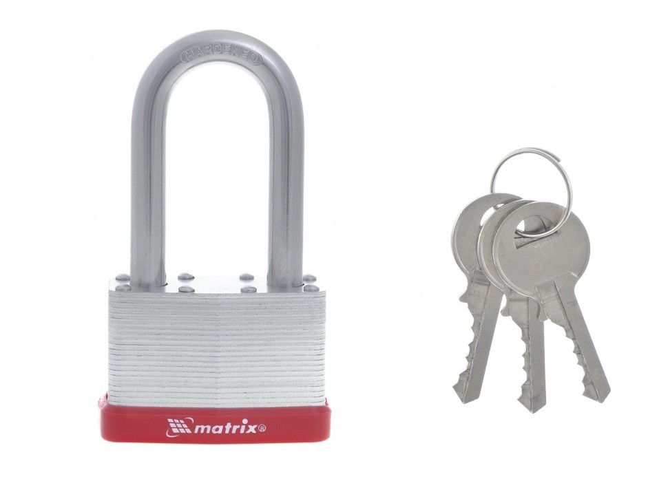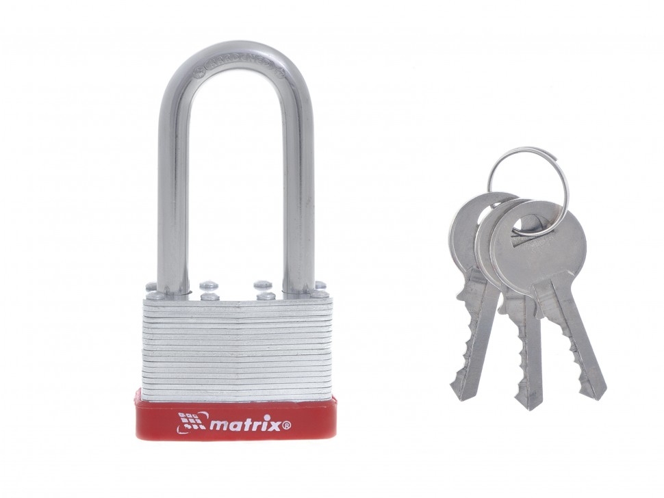 Навесной замок Matrix 91809 с удлиненной дужкой, 50 мм, вешается на дверь для защиты помещения. Он пригодится для запирания дверей гаража, подсобок и др. Дужку диаметром 9 мм сложно перекусить или сорвать, это повышает взломостойкость замка.