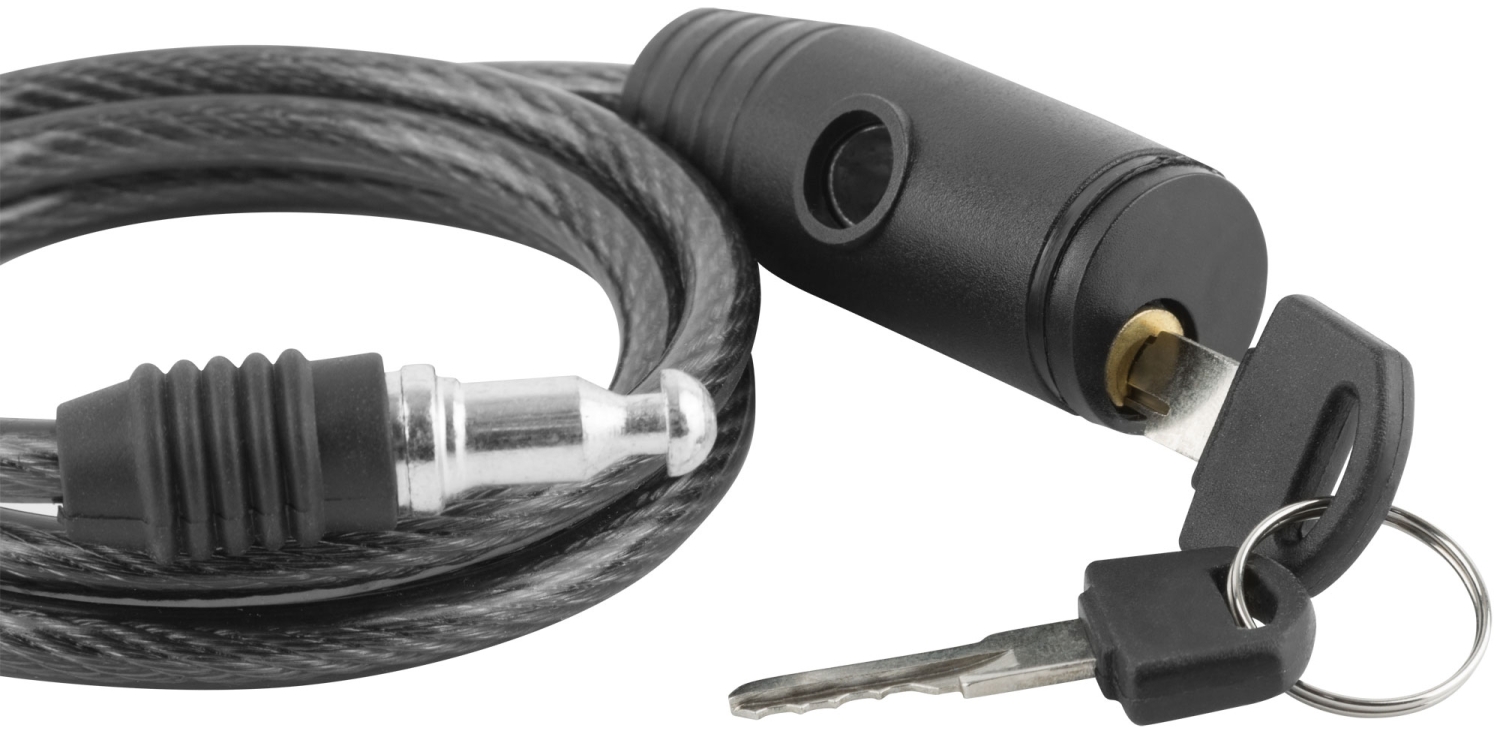 Тросовый замок — гибкое противоугонное устройство среднего класса для защиты велосипедов, мототехники и колясок. Стальной трос диаметром 6 мм с ПВХ-оплеткой вставляется в пластиковый корпус с цилиндровым механизмом и латунным сердечником.